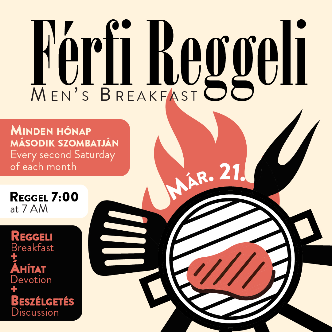 Március 21-én szombat reggel ismét férfi reggelit tartunk. Ez egy rövid beszélgetés az Ige és étel mellett, ahol megoszthatjuk egymással az örömünket, problémáinkat és beszélgetünk az Igéről. Mindenki számára nyitott az alkalom. Gyertek!